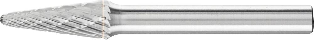 Rundkegelförmiger Frässtift mit runder Kuppe nach DIN 8032 und Verzahnung nach DIN 8033.