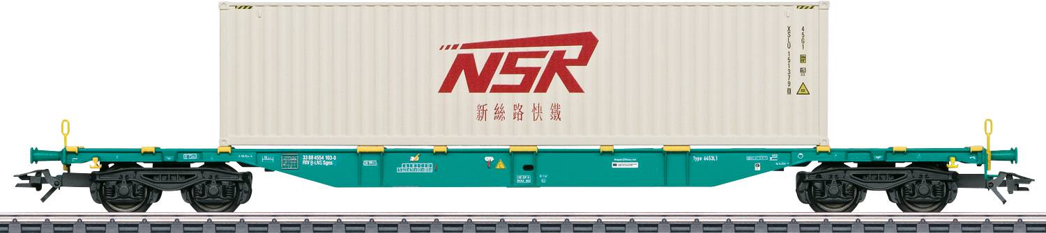 Vorbild: Vierachsiger Container-Tragwagen Bauart Sgns für den kombinierten Ladungsverkehr der Lineas NV/SA, registriert in Belgien. Beladen mit einem 40-ft. High-Cube Boxcontainer. Betriebszustand um 2020.