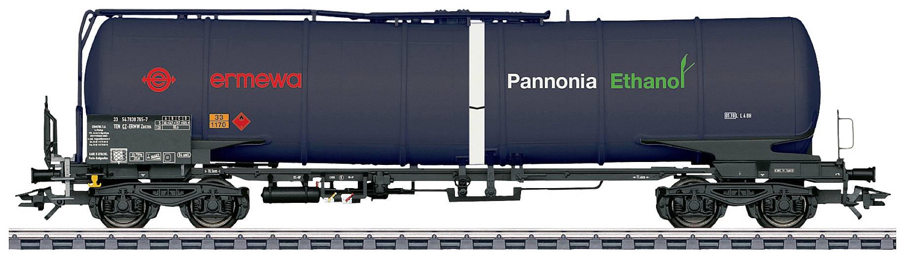 Vorbild: Vierachsiger Kesselwagen Bauart Zacns mit einem Fassungsvermögen von 95m3. Privatwagen der Ermewa S.A.S., registriert in Tschechien. Graphitgraue Grundfarbgebung. Betriebszustand ab 2015. Modell: Drehgestelle der modernen Bauform Y25Lsd1 mit Doppelbremsklötzen. Mit Bremserbühne und stirnseitigem Aufstieg. Separat angesetzte Bremsgestänge, Entleerungsrohre, Domdeckel, Abweisbügel und zahlreiche weitere Hebel und Griffstangen. Abweisbügel aus Metall. Länge über Puffer ca. 19,6 cm. Gleichstromradsatz E700580. Einen weiteren Kesselwagen mit anderer Betriebsnummer finden Sie im Trix H0-Sortiment unter der Artikelnummer 24225 mit dem Hinweis auf die benötigten Tauschradsätze.