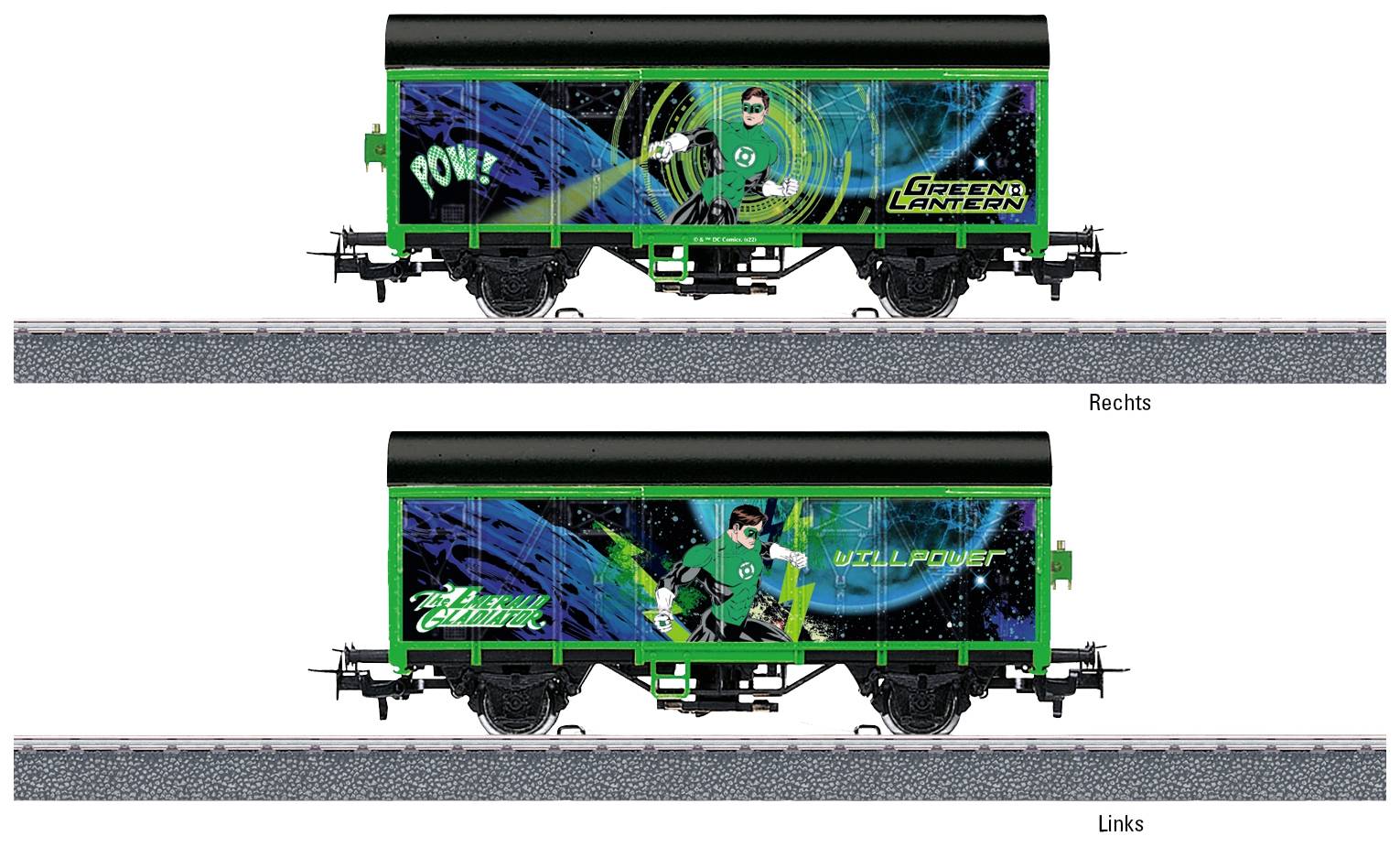 Güterwagen in einer tollen Gestaltung zum Superhelden Green Lantern. Mit Stromzuführung und beleuchteter Wagenlaterne. Mit RELEX-Kupplungen für schnelles und einfaches Kuppeln. Wagenlänge 11,5 cm. Inklusive einer Green Lantern Spielfigur aus Metall. Größe der Spielfigur 4 cm. Ideale Erweiterung durch die Startpackung Batman 29828 und die weiteren Superhelden Artikel 36656, 44825, 44826, 44827, 44828 und 44829.