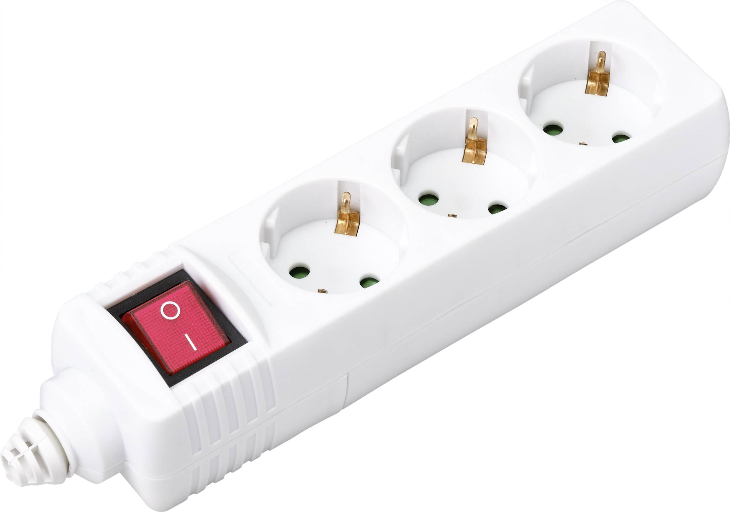 Diese Stromleiste ohne Kabelzuleitung bietet Schutzkontaktanschlüsse für bis zu drei elektrische Geräte, und diese Steckplätze können auch tatsächlich alle genutzt werden: Die Buchsen sind um 45° verdreht auf der Leiste angebracht, damit sich abgewinkelte Schutzkontaktstecker nicht gegenseitig in die Quere kommen. Die Kontaktbuchsen sind darüber hinaus mit einem erhöhten Berührungsschutz versehen: Schutzklappen verhindern das unbeabsichtigte Berühren der Leitungen, denn die innenliegende Drehflügel-Sicherung öffnet sich nur bei gleichzeitigem Druck auf beide Kontaktöffnungen. Für das simultane Ein- und Ausschalten der Steckplätze steht ein Masterschalter zur Verfügung.