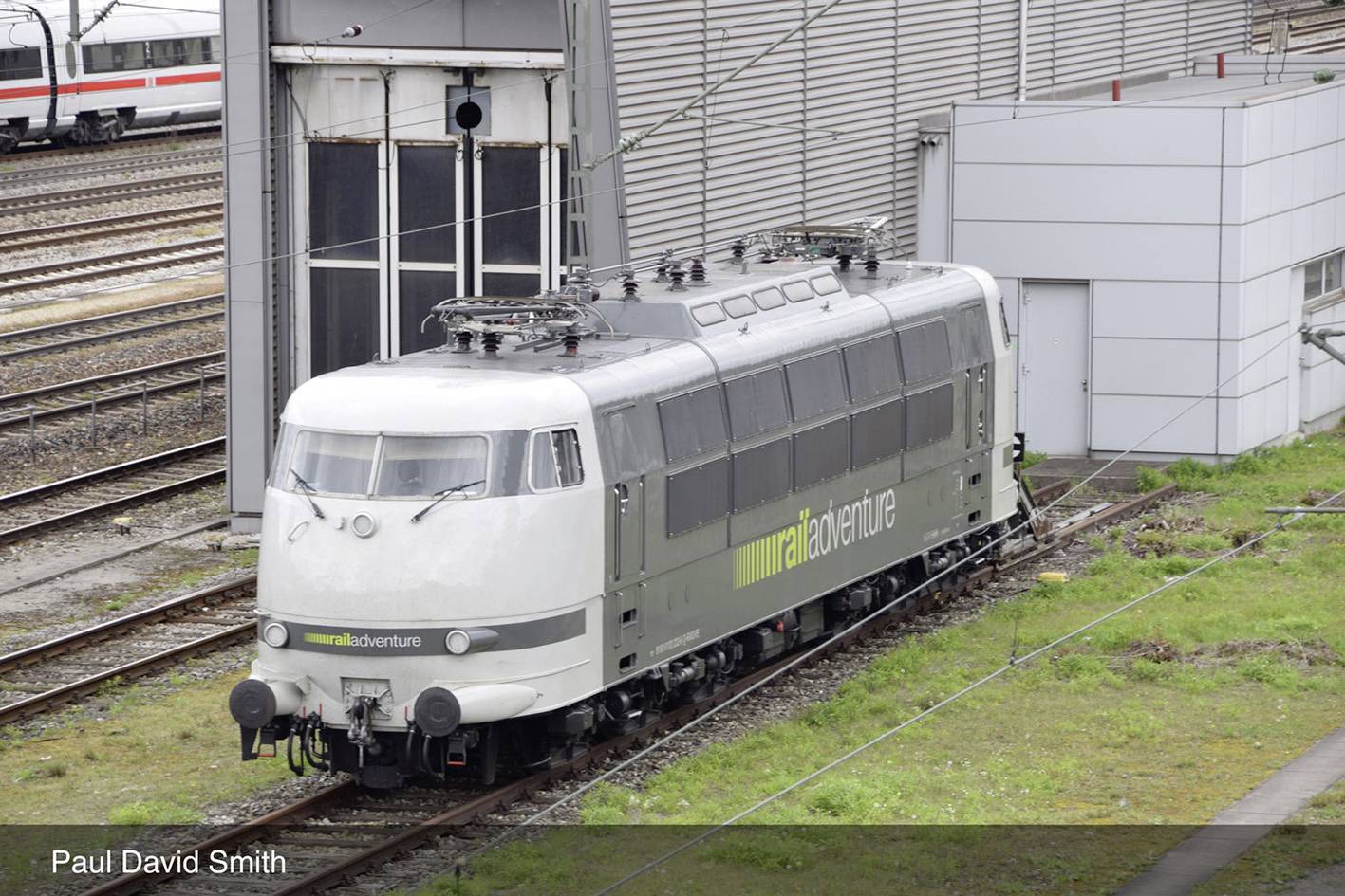 RailAdventure, Elektrolokomotive 103 222-6, mit langen Führerständen, Einholmstromabnehmer, in grauer Lackierung.
