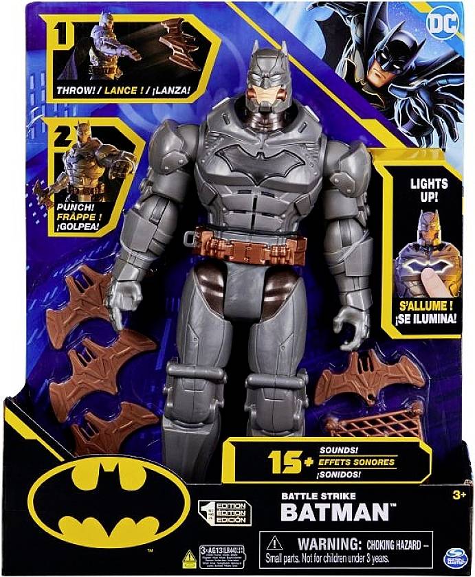 Wie lassen sich die nachgespielten Batman-Missionen noch cooler gestalten- Mit der einzigartigen Batman Deluxe-Actionfigur! Neben Licht- und Soundeffekten (Batterien enthalten) besitzt diese 30cm Figur im massivem Kampfanzug eine Wurf- & Schlagfunktion. Bewegt man Batmans Beine, so wirft er die enthaltenen Ausrüstungsgegenstände (Batarang, Wurfnetz oder Batarang am Seil) nach seinen Widersachern, um diese zur Strecke zu bringen. Ohne Accessoires in der Hand übt er eine Schlagbewegung aus, die jeden Bösewicht aus den Socken haut. Mit der Ausrüstung in der Hand ist Batman perfekt ausgestattet für gefährliche Abenteuer in Gotham City. Wird ein Widersacher auf offener Straße gestellt, macht Batman mit coolen Geräuschen und Lichteffekten auf sich aufmerksam, die beim Berühren von Batmans Brust ertönen/sichtbar werden. Mit der Menge an Bewegungspunkten dieser imposanten Batman-Figur lassen sich die unterschiedlichsten Actionposen nachstellen.