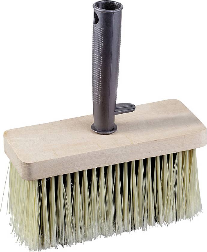 Kunststoff-Borsten für grobe Farb- oder Kleister-Aufträge, mit einem festen Halt der Borsten in einem Naturholzplatte, Kunststoffgriff mit praktischen Eimerhaken, leicht zu reinigenden Borsten nach dem Gebrauch, geeignet für alle groben Farb-, Lasur- oder Kleisteraufträge.