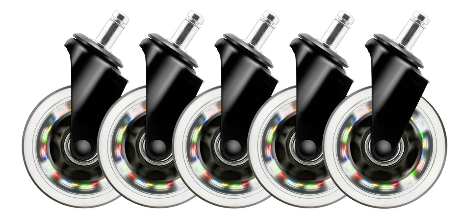 Vervollständige deinen Gaming Stuhl mit einem Satz Regenbogenrollen mit bewegungsgesteuerten LEDs. Keine Batterien erforderlich, die LEDs leuchten durch die rollende Bewegung. Die Lenkrollen bestehen aus hochwertigem Polyurethan für eine starke Bodenhaftung und sind mit Präzisionskugellagern aus Industriestahl für reibungslose und präzise Bewegungen ausgestattet.